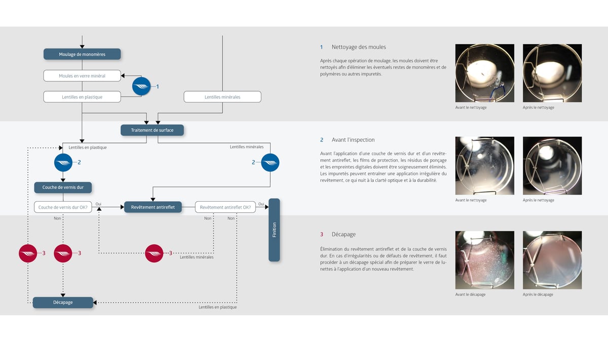 Lors de la fabrication de lentilles ophtalmiques, il est essentiel que chaque étape du procédé réponde aux exigences de propreté les plus élevées et qu’aucune impureté ne soit entraînée. Nous avons étudié ces procédés en détail et identifié les étapes de procédé pour lesquelles les exigences de nettoyage les plus élevées doivent être respectées afin d’obtenir des résultats optimaux.